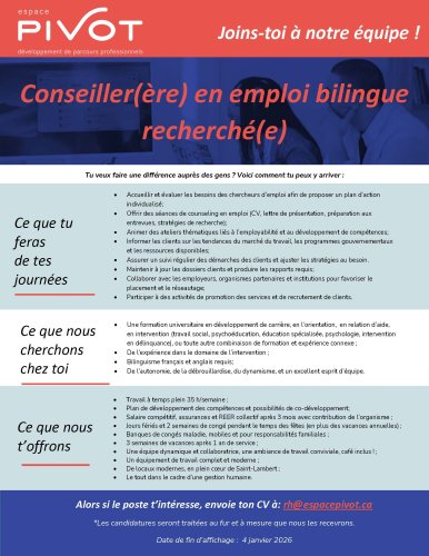 - Une formation universitaire en développement de carrière, en l’orientation, en relation d’aide, en intervention (travail social, psychoéducation, éducation spécialisée, psychologie, intervention en délinquance), ou toute autre combinaison de formation et expérience connexe ;