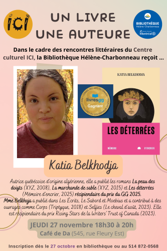 Nous sommes heureux d’accueillir Katia Belkhodja pour la dernière rencontre de la saison d’automne de notre série UN LIVRE... UN AUTEUR !
