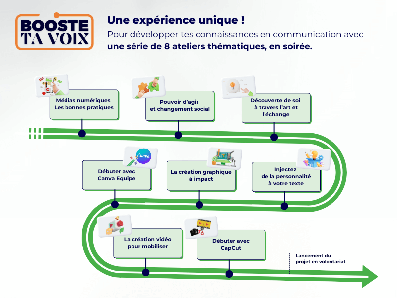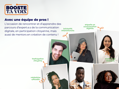 Rejoins vite le programme âBooste ta voixâ*, une sĂ©rie dâateliers conçue sur-mesure qui te permettra de dĂ©couvrir le potentiel des mĂ©dias numĂ©riques au service des causes sociales ; avec :